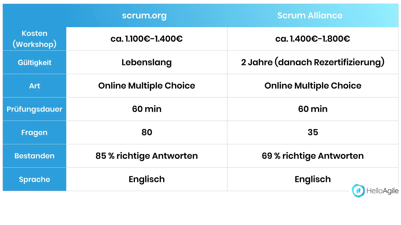 Wer langfristig sparen möchte ist bei scrum.org daher besser aufgehoben. Hier sind die Kosten für den Workshop günstiger und man kann sich ein Leben lang Professional Scrum Master™ nennen, ohne sich Gedanken über eine Verlängerung der Lizenz zu machen. Wer hingegen eine quasi 100%-Bestehgarantie sucht, der muss mehr Geld in die Hand nehmen und etwas mehr Zeit mitbringen. Initial für den Workshop, alle zwei Jahre für die Verlängerung des Zertifikates und für das dauerhafte Sammeln von Scrum Education Points.
